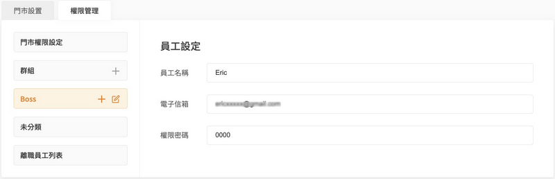 - 可設定門市權限的群組,建議可以依照部門或職位區分群組。