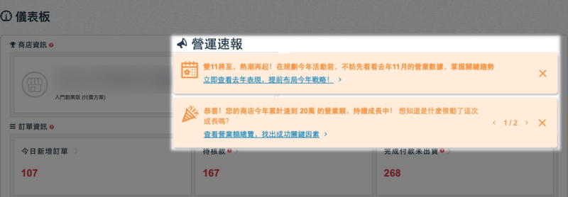- 登入商店後台 ➜ 儀表板會顯示【營運速報】資訊,此處會顯示「節慶預告」及「里程碑」相關資訊,點擊連結可檢視對應的數據頁面。(部份數據需擁有數據中心Pro才能檢視喔!)