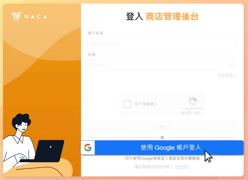 如果您登入後台的電子信箱,剛好是使用 Google 的個人或企業版信箱服務,也可以使用「Google 登入」登入後台唷!從商店管理後台登入頁,點擊 [使用 Google 帳戶登入] 可直接設定兩步驟驗證。