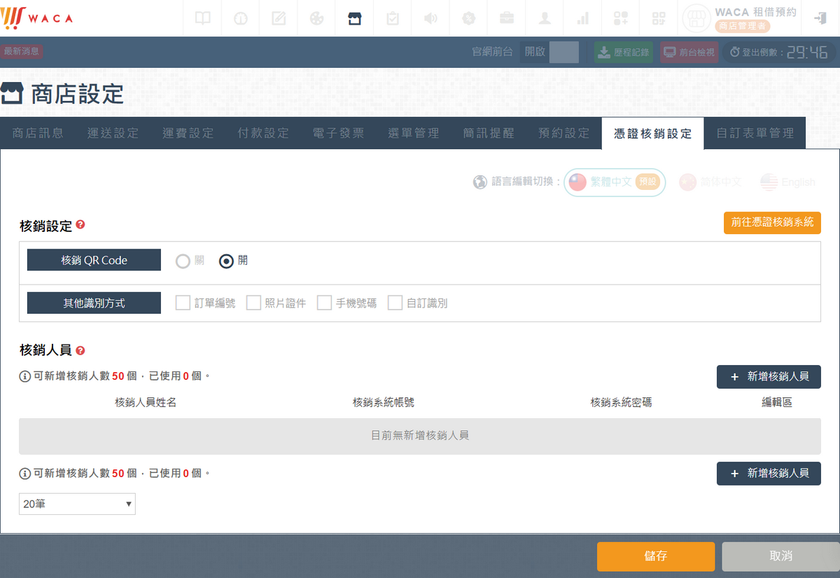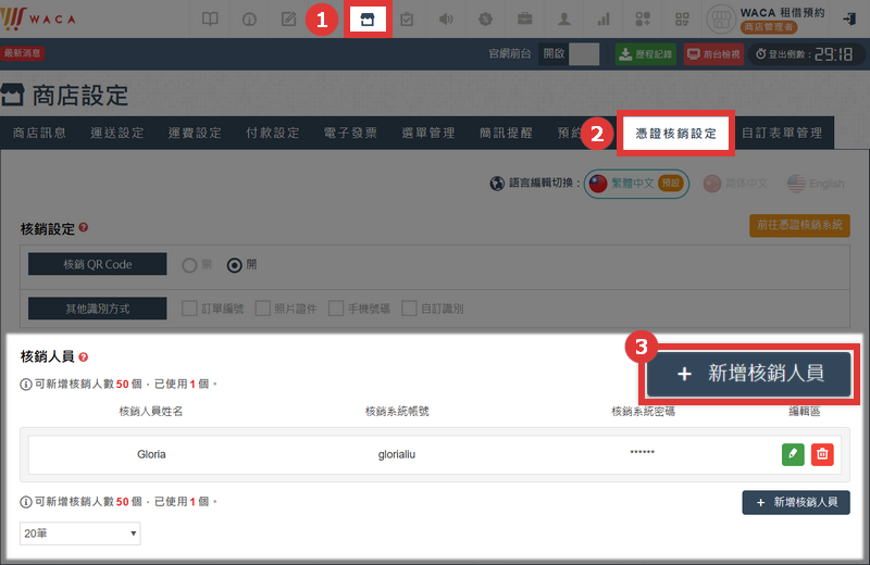 路徑:商店設定 ➜ 憑證核銷設定 ➜ 點擊 +新增核銷人員 按鈕。