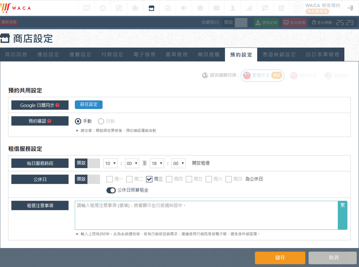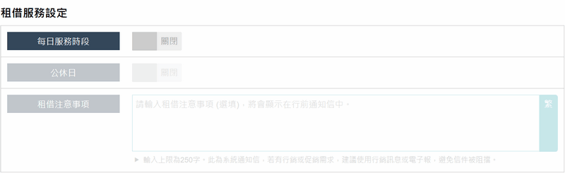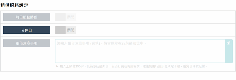 租借預約服務可設置【每日服務時段】【公休日】及【租借注意事項】資訊: