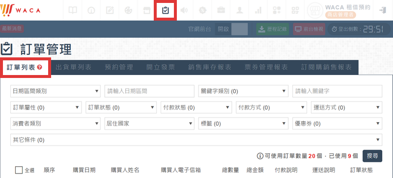 進入訂單管理後,需要先篩選出需要處理的訂單清單,可使用篩選功能找出目標的訂單: