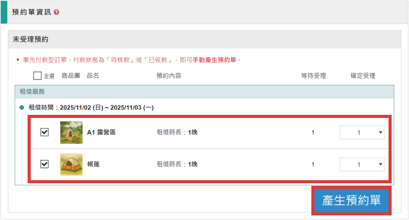 勾選確認可以受理預約的品名及選擇受理數量後,請點擊 產生預約單 按鈕。(若租借時間已經過期,則無法產生預約單)