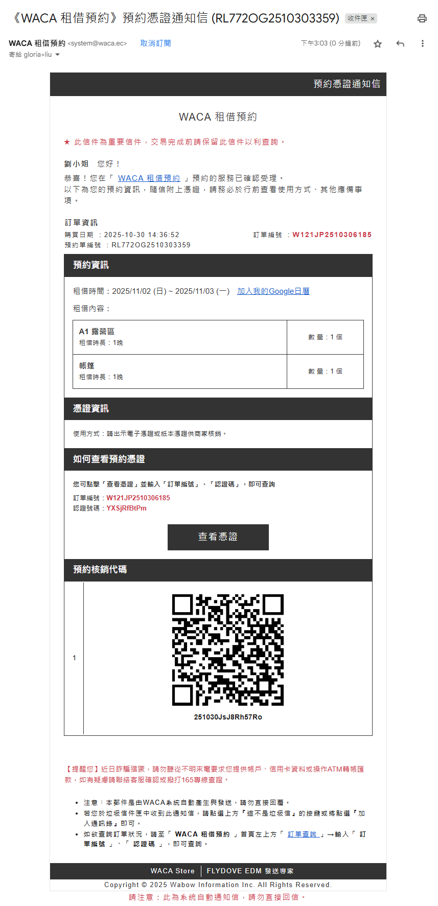 預約單產生的同時,體驗人會收到「預約憑證通知信」,信件內容包含訂單/預約單編號、預約資訊、憑證資訊、如何查看預約憑證教學及預約核銷代碼等資料。