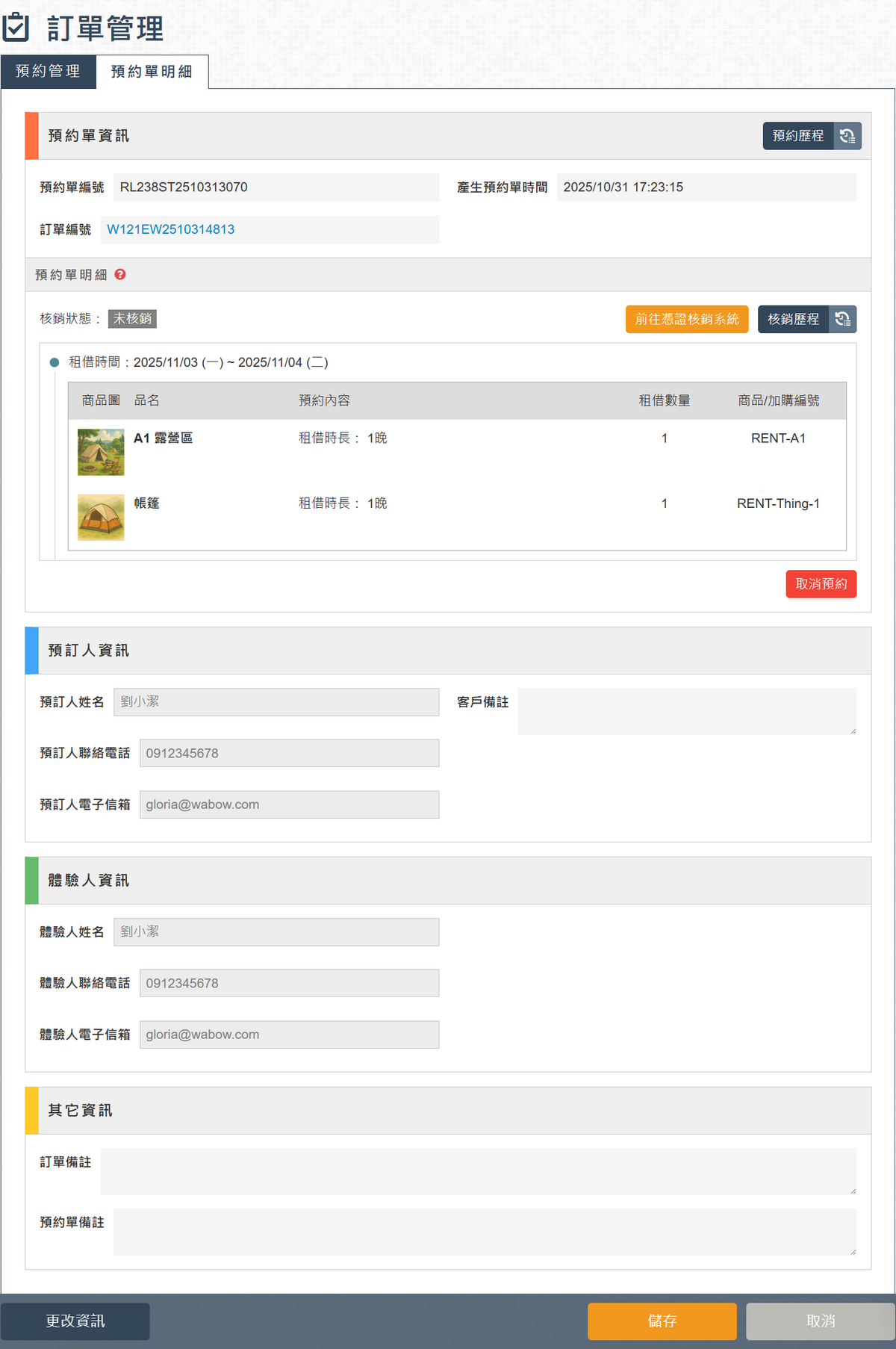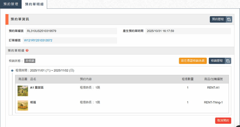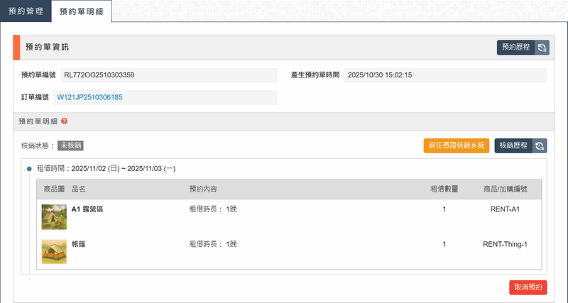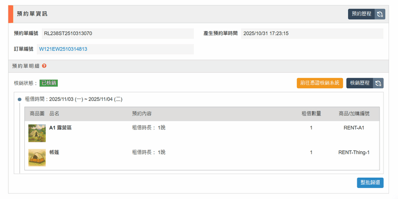 顧客前往租借/住宿地點,工作人員完成 [憑證核銷作業] 後,預約單的核銷狀態會轉為 已核銷 ;租借到期日後,顧客會歸還商品/進行退房,此時請至訂單管理 ➜ 預約管理 ➜ 預約單明細,點擊 整批歸還 按鈕完成歸還/退租手續;並且在預約單明細內的核銷狀態會顯示歸還時間資訊。
