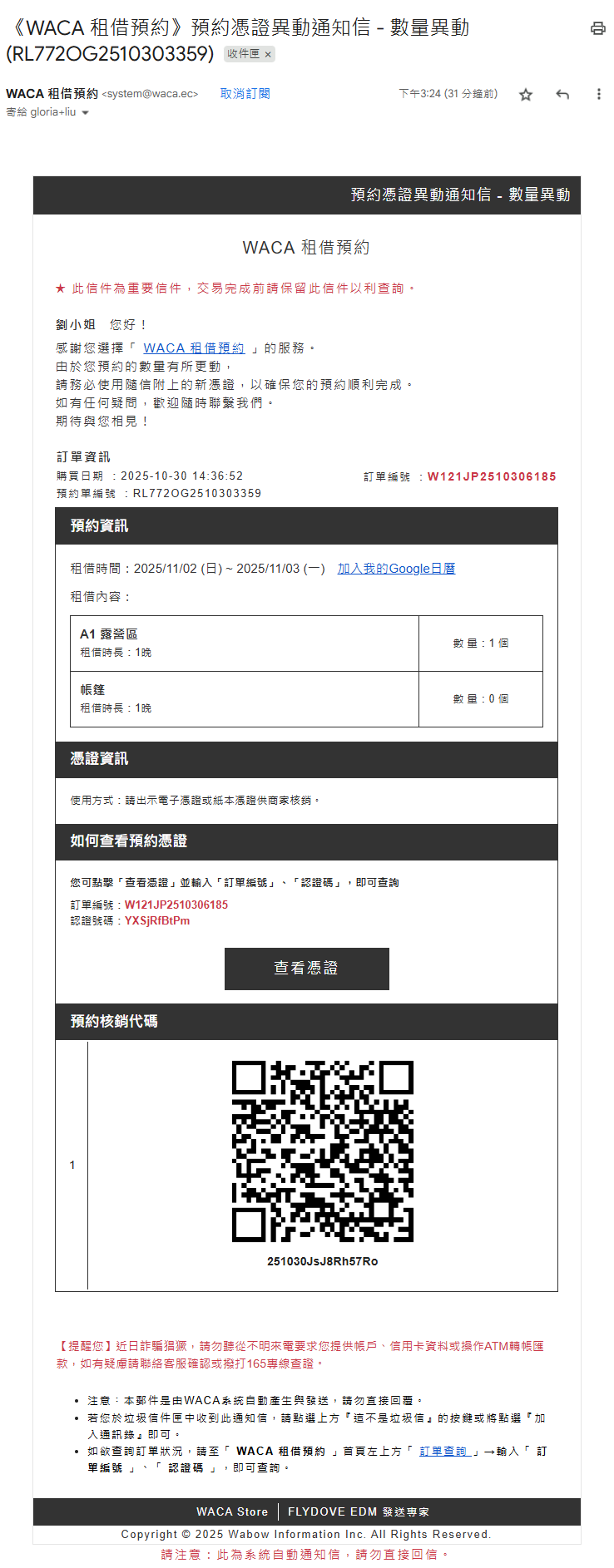 - 租借預約數量若為分次受理,後續受理預約時,顧客會收到「預約憑證異動通知信」,通知信中會更新受理預約的數量,核銷代碼不變。