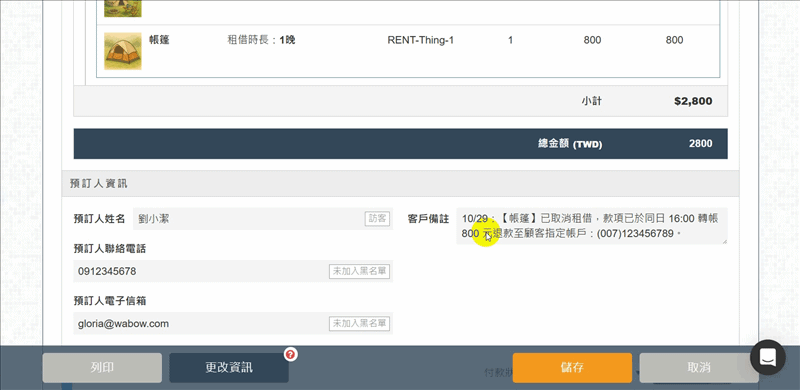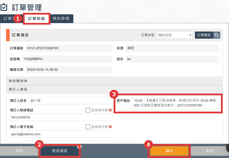 接下來請至訂單明細 ➜ 點擊下方 更改資訊 按鈕 ➜ 至預訂人資訊內的【客戶備註】欄位填入「退款原因」「退款日期」「退款方式」「退款金額」「處理人員」等資訊後 ➜ 點擊 儲存 按鈕完成編輯。
