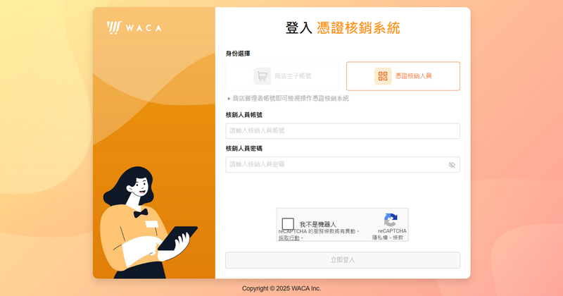 - 使用「多帳號管理」功能幫負責的工作人員設置專用子帳號,並至帳號管理開啟子帳號的【憑證核銷權限】檢視權限,工作人員登入 WACA 後台即可進入憑證核銷系統進行核銷作業。