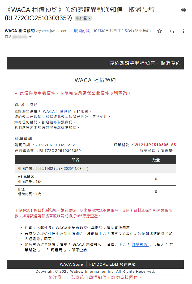 同一筆租借預約單全部取消租借後,系統會發送「預約憑證異動通知信-取消預約」至體驗人信箱。