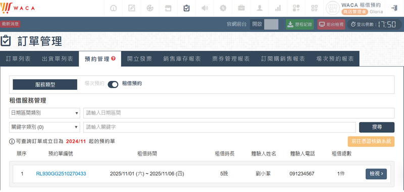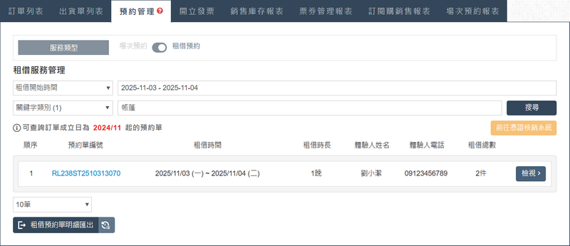 若需確認指定日期區間的已受理預約的預約單資訊,進入「訂單管理」 ➜ 預約管理 ➜ 服務類型選擇【租借預約】,可透過篩選方式搜尋指定日期區間的預約單資訊: