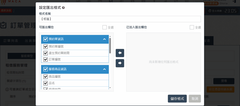 - 選擇匯出格式:若想針對特定商品(品名)匯出備貨使用,建議可新增匯出格式,未來需要整理清單時,可以直接選擇格式名稱匯出所需要的欄位資料。