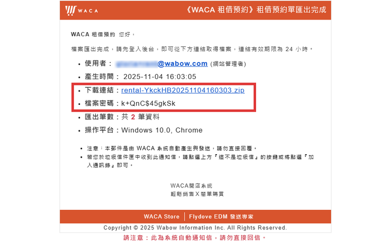 匯出租借預約單明細後,信箱會收到租借預約單匯出完成通知信,內含 Excel 檔下載連結以及檔案密碼。