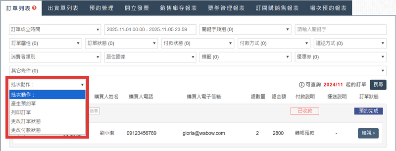 - 接下來依照畫面指示即可執行批次處理作業,一次產生多筆預約單、列印多筆訂單,及一次更新訂單/付款狀態。