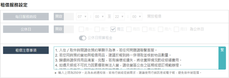 - 開啟:可設置固定周幾公休,並可額外依需求決定租借日跨公休日時,是否一樣要向顧客收取公休日當日的租金。
