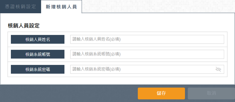 - 新增「核銷人員」,設定核銷系統帳號密碼,工作人員輸入核銷系統帳號密碼登入進行核銷作業;相關設定說明如下: