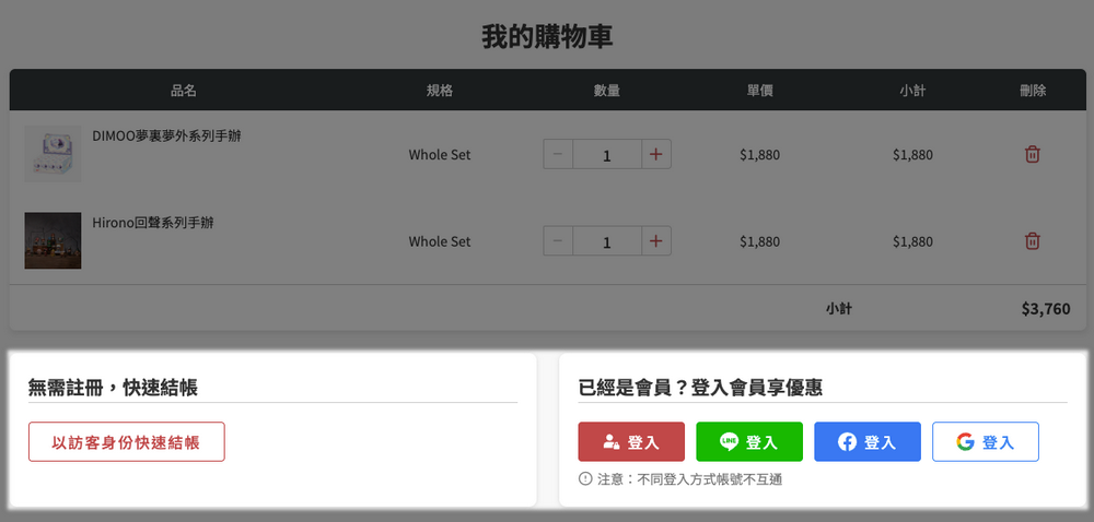 介面改為卡片式設計,強化訪客身份購物的視覺辨識度。