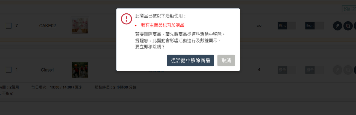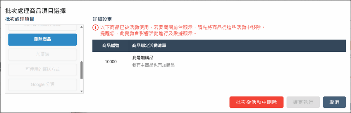 - 刪除商品/關閉前台顯示,新增「從活動中移除商品」「批次從活動中移除商品」功能。
