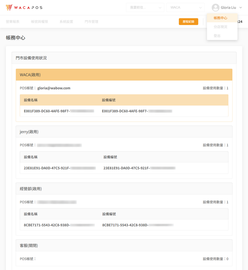 - POS 管理後台 › 帳務中心 › 門市設備使用狀況,介面優化。