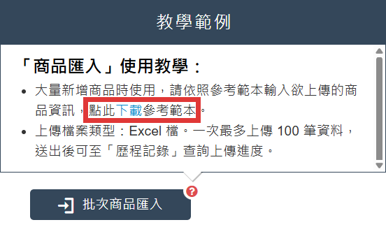 依範本欄位填入商品資料後上傳,解析成功率最高。若使用其他平台匯出的 Excel,系統會嘗試自動對應,但欄位差異可能影響解析結果。